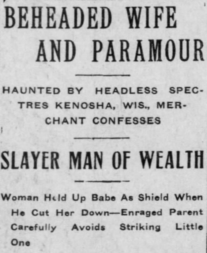 “I became as one insane. I ran to a woodshed and seized a lumberman’s axe then I carefully raised the window and entered. My arm strengthened by the sight, I chopped off my cousin’s head at the first blow of the axe. He did not move but the sound of the blow aroused my wife.”