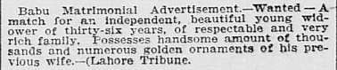 This 1905 Babu Matrimonial Advertisement introduces us to a gentleman of 36 who is a self-described “independent, beautiful young widower… very rich family.” As if this wasn’t enough to start an all-out war for his affections, our hero (whom we’ll call Catfish) subtly mentions he still has his late wife’s jewelry.