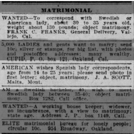 Next up, we have Frank C. Franks, who was seeking a wife of either Swedish or American origin in 1910. Specifically, a Swedish or American wife who weighs about 130 lbs. But before you go thinking it’s a little shallow of Frank Franks to dictate his future wife’s weight, check out J.A. Scott, who is looking for 14-year-old “Spanish lady correspondents”.